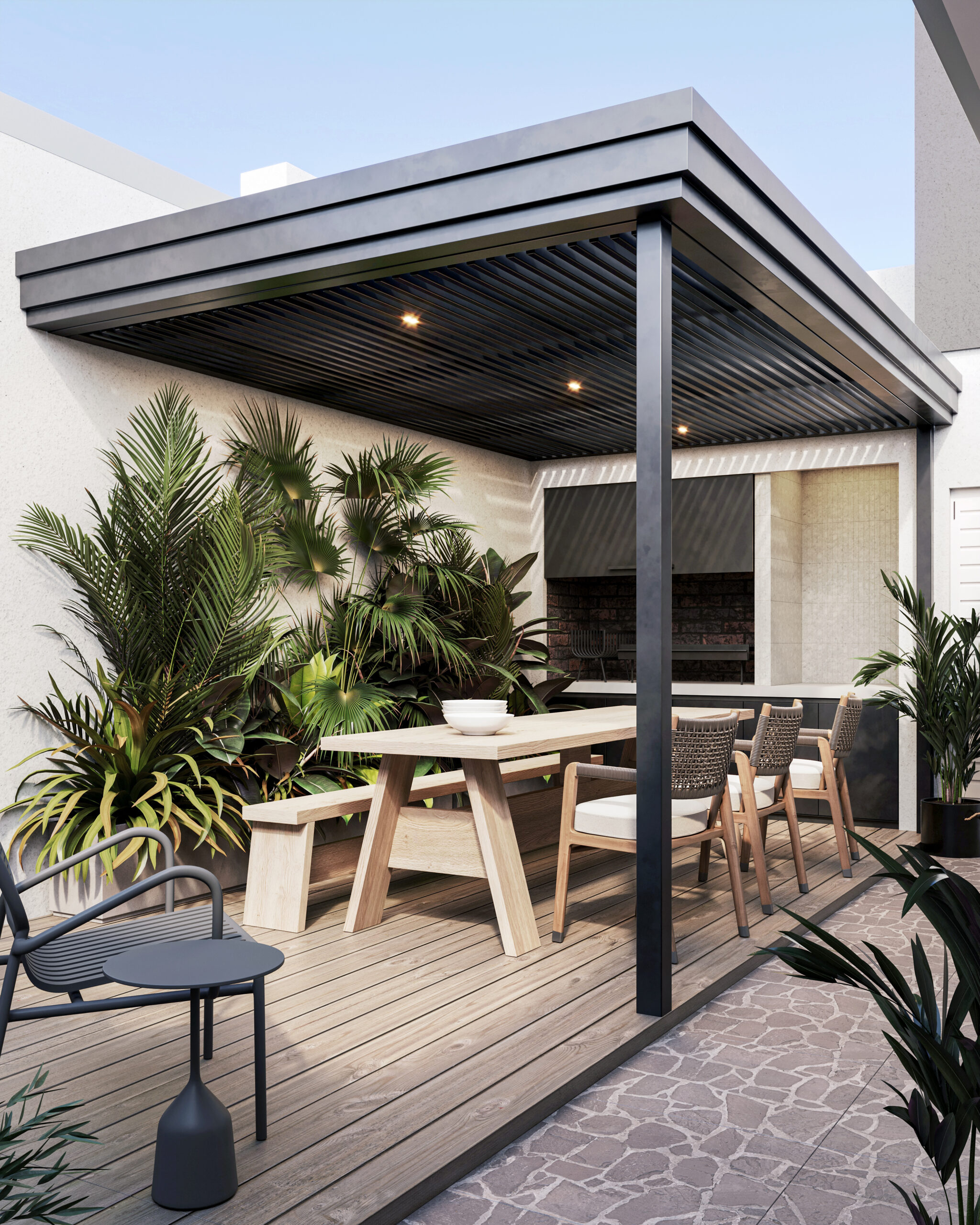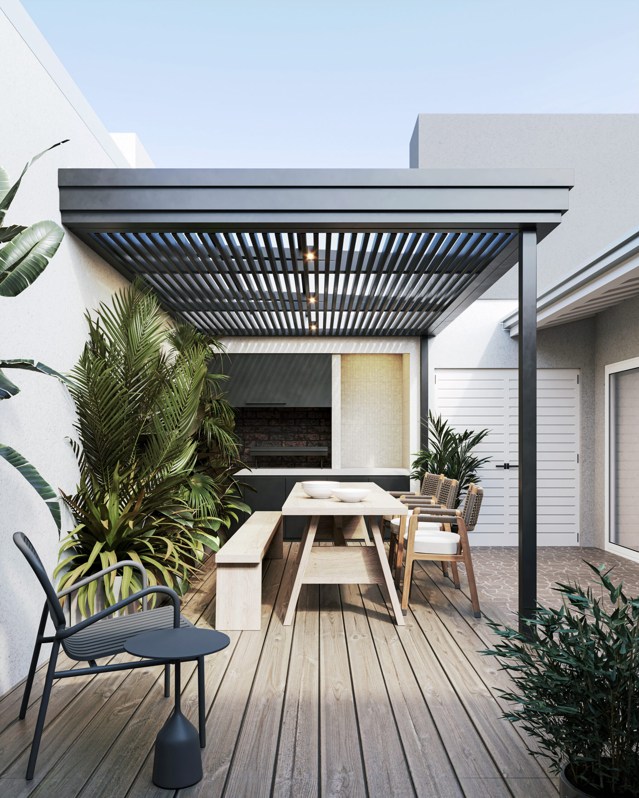 Al seleccionar los materiales, priorizamos la durabilidad y el bajo mantenimiento. Utilizamos EPS para el deck, eliminando la necesidad de repintar la madera. La estructura metálica de la pergola también se adapta a esta paleta de colores y facilita su conservación a largo plazo.
