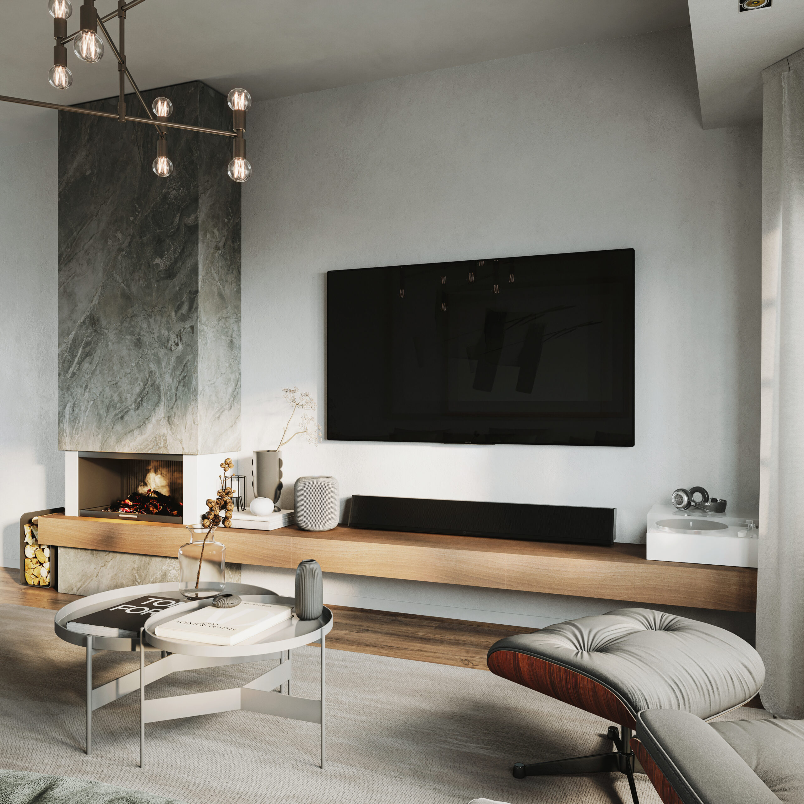 Para romper con la verticalidad que genera el hogar, se diseñó un estante flotante con una cajonera oculta que brinda un espacio de guardado y decoración, convirtiéndose en un elemento clave para la funcionalidad y el diseño del ambiente. Además, este estante flotante también actúa como un elemento decorativo, aportando un toque personal y moderno al espacio.