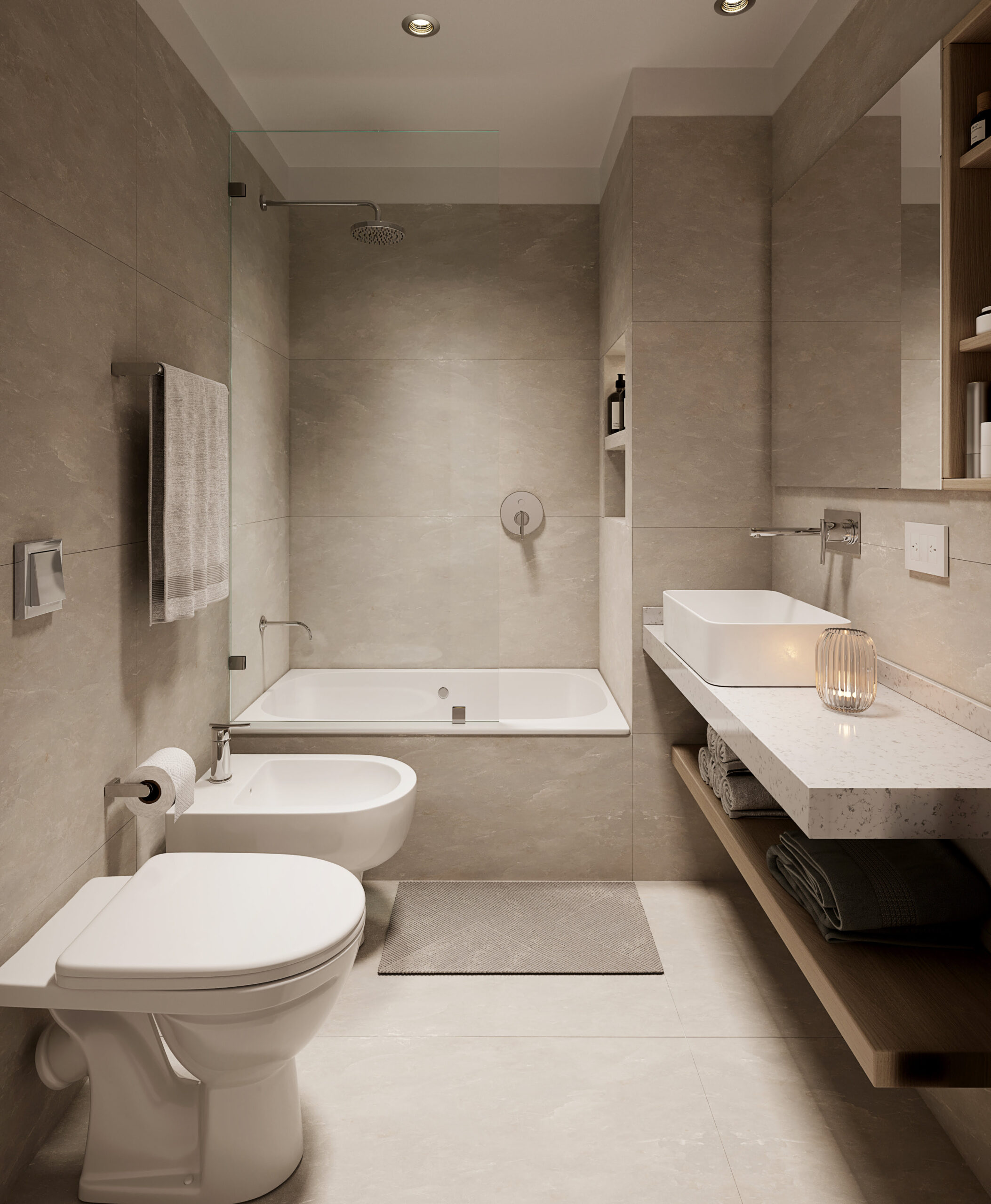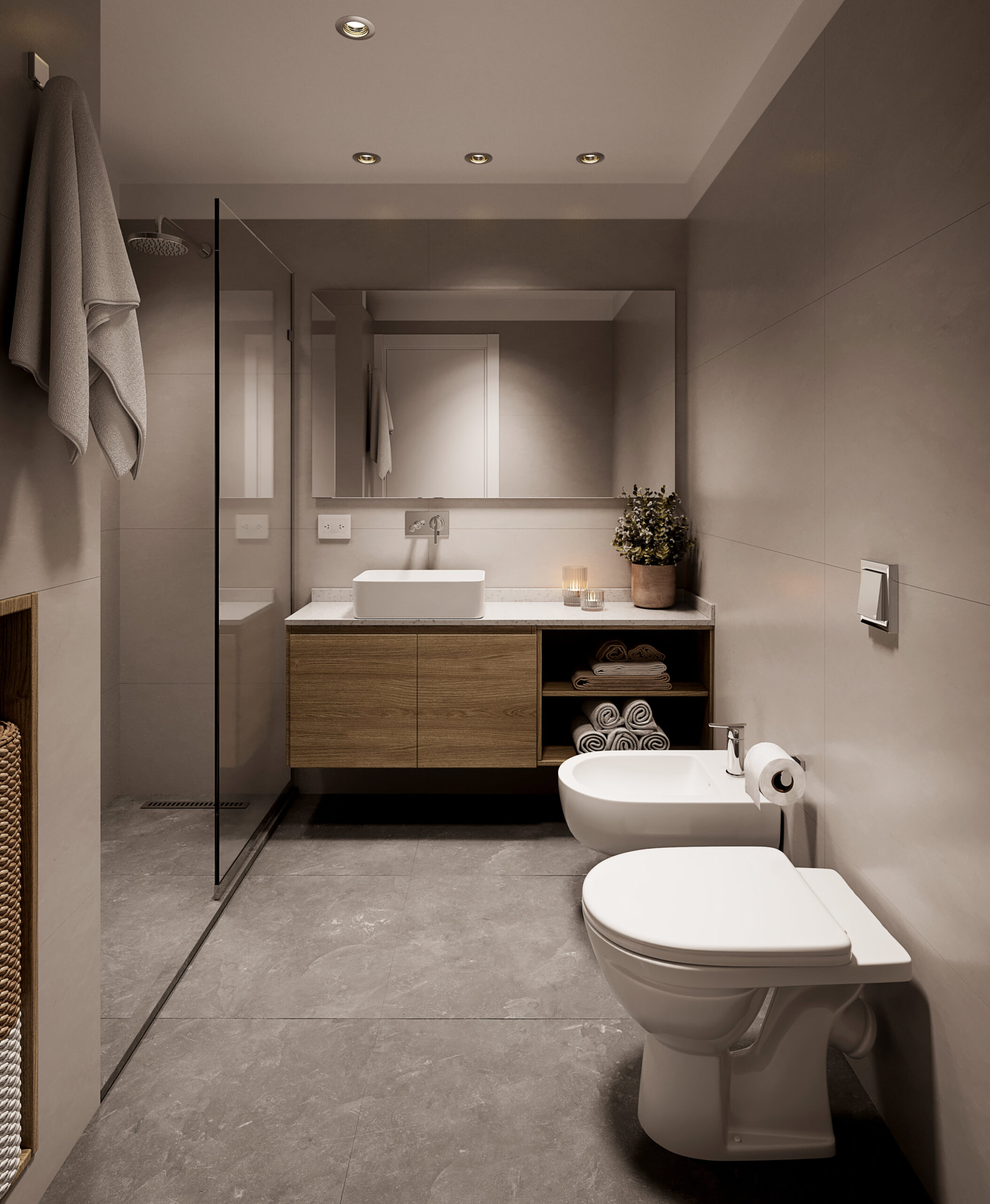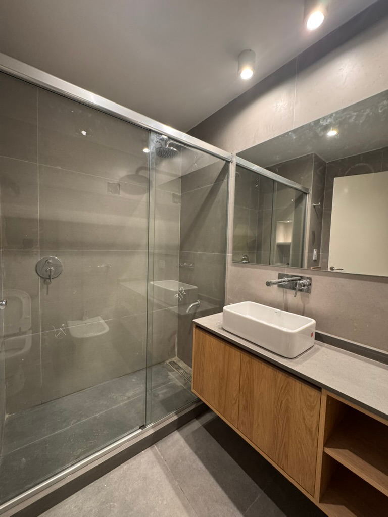 En los baños, trabajamos con una premisa clara: optimizar el espacio de guardado sin perder elegancia. Diseñamos nichos integrados en las paredes, que no solo ofrecen soluciones funcionales sino que también aportan continuidad visual. En el baño en suite, destacamos la continuidad del material en pisos y paredes, generando una ducha al ras del suelo que aporta una sensación de amplitud y modernidad.