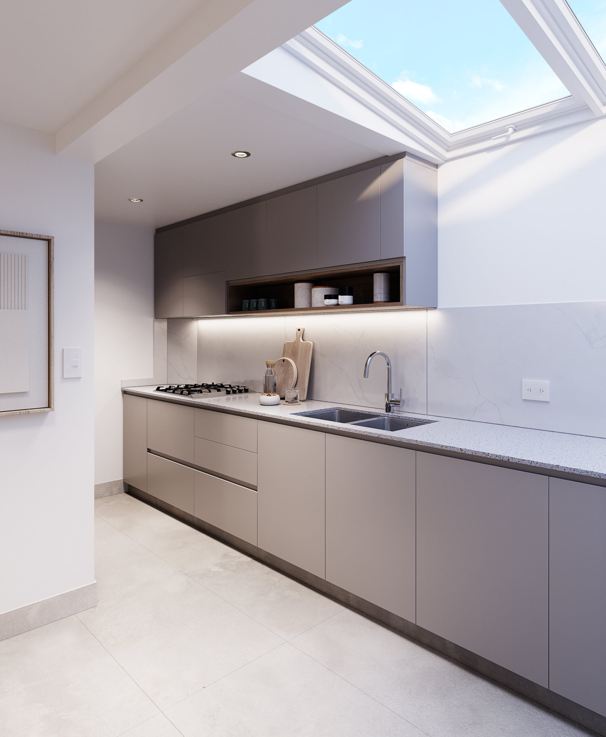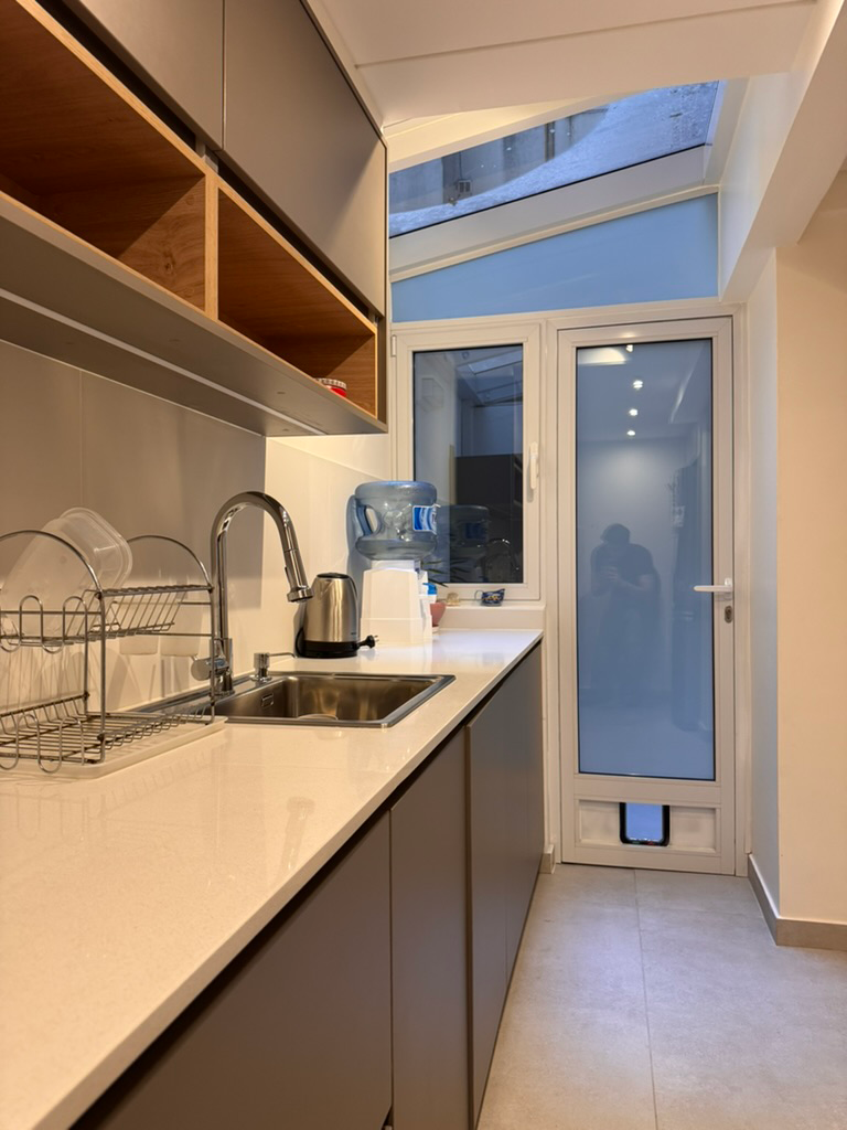 El principal desafío fue rediseñar la cocina, transformándola en el verdadero núcleo del hogar. Para ello, eliminamos el antiguo dormitorio de servicio y ampliamos la cocina hacia el patio interno, que se cerró con una cubierta vidriada. Este cambio permitió integrar un lavadero funcional y crear una conexión fluida entre la cocina y el nuevo espacio. Además, incorporamos una estación de café en el comedor diario, aprovechando la espalda de los electrodomésticos, logrando un rincón práctico y acogedor.