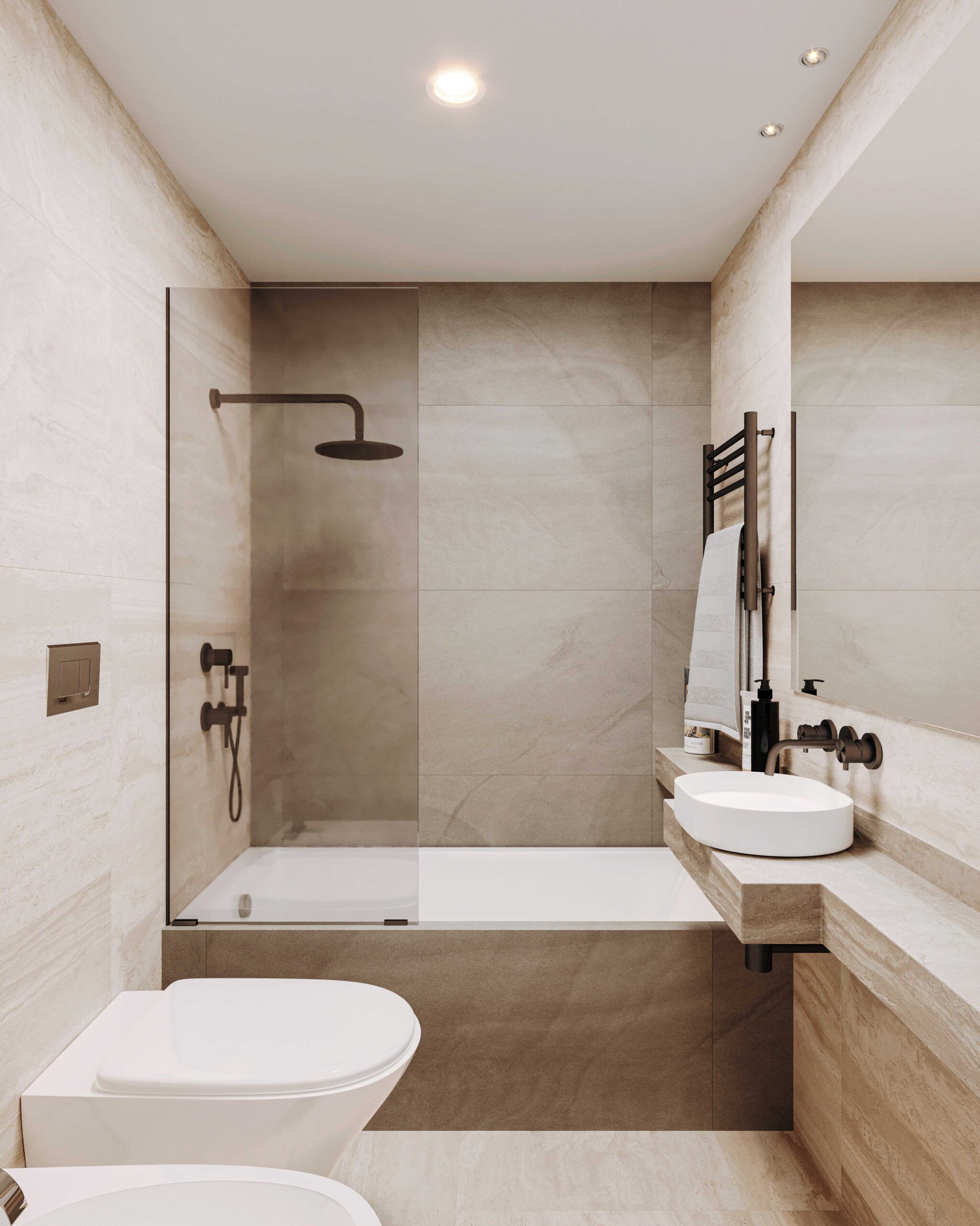 En el baño principal, se mantuvo la bañera pero se le otorgó una impronta moderna mediante un juego de revestimientos que generan un contraste en el fondo de la misma. Además, se instaló grifería monocomando de pared y un lavatorio de apoyo para maximizar la funcionalidad y la estética contemporánea del espacio.