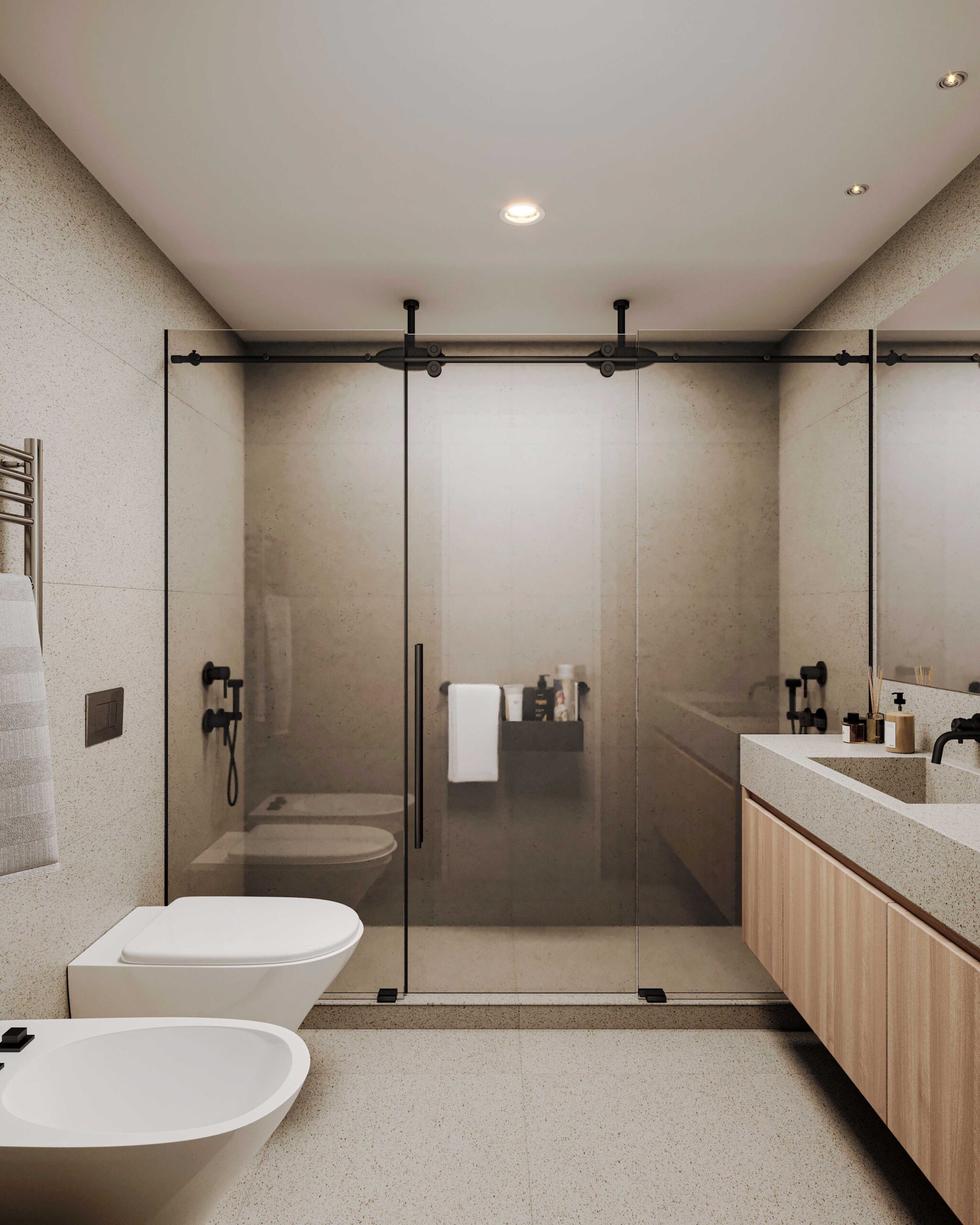 En cuanto a los desafíos encontrados durante la remodelación del baño en suite, el mayor de ellos fue la incorporación de la flor de la ducha en el cielorraso. Este trabajo implicó un análisis detallado de la presión de agua de la torre para asegurar un funcionamiento estable de las dos flores de ducha. Se logró mantener la continuidad del diseño al seguir con el mismo solado en el interior del nicho de la ducha y al utilizar desagües lineales con revestimiento para minimizar cualquier objeto que interrumpiera la armonía visual.