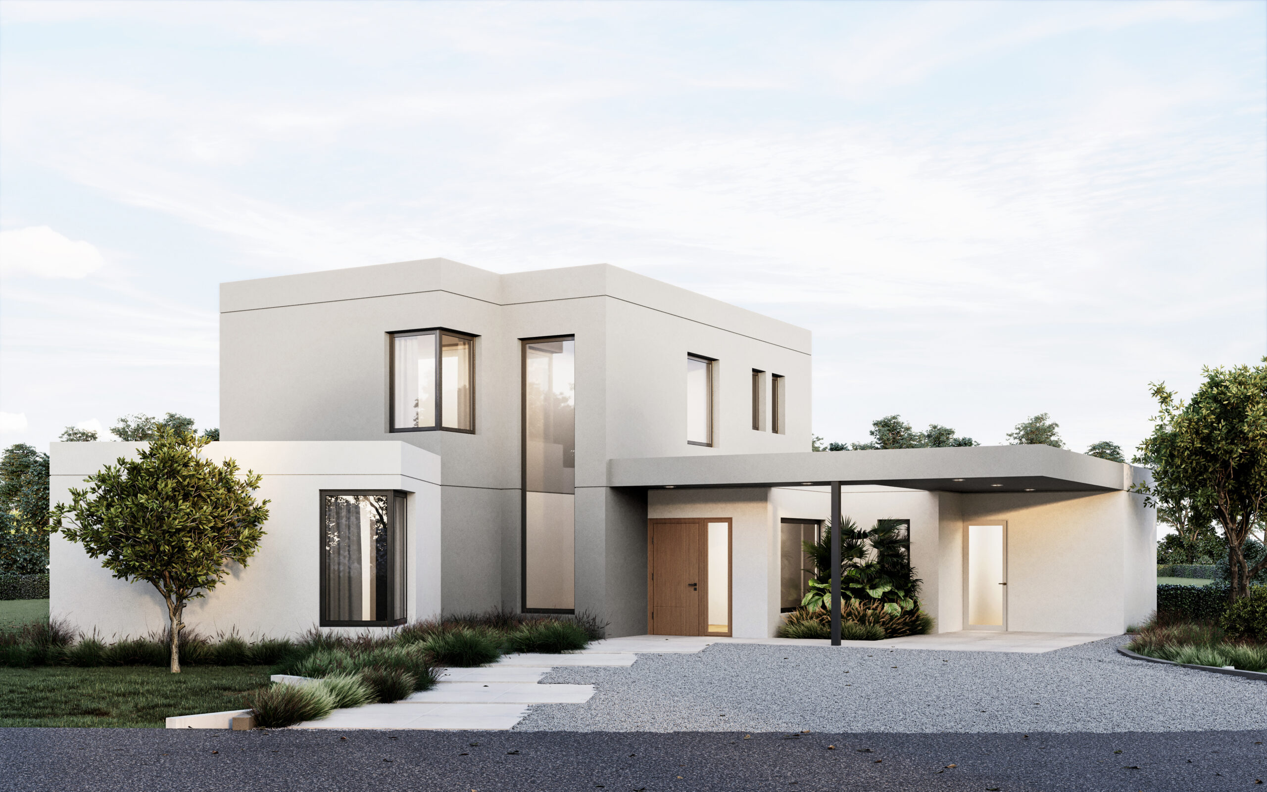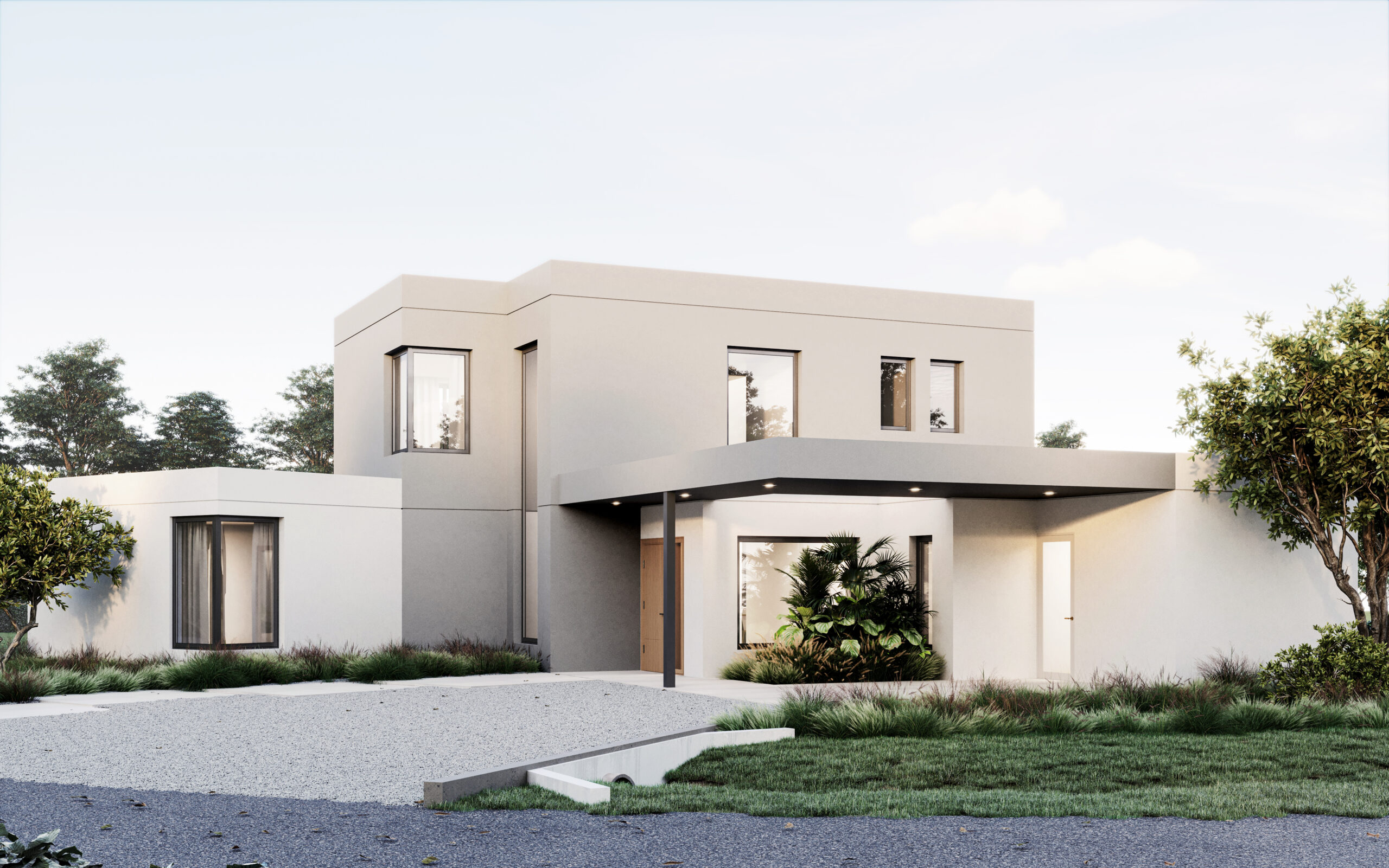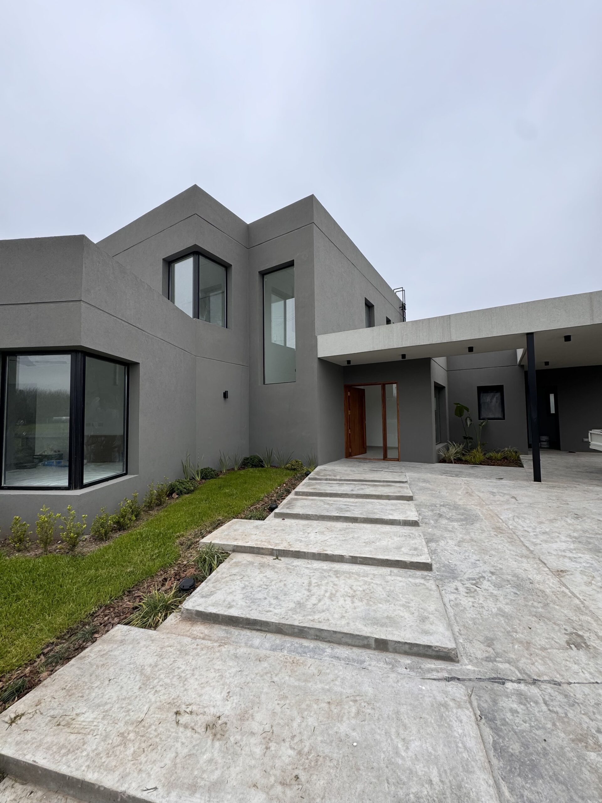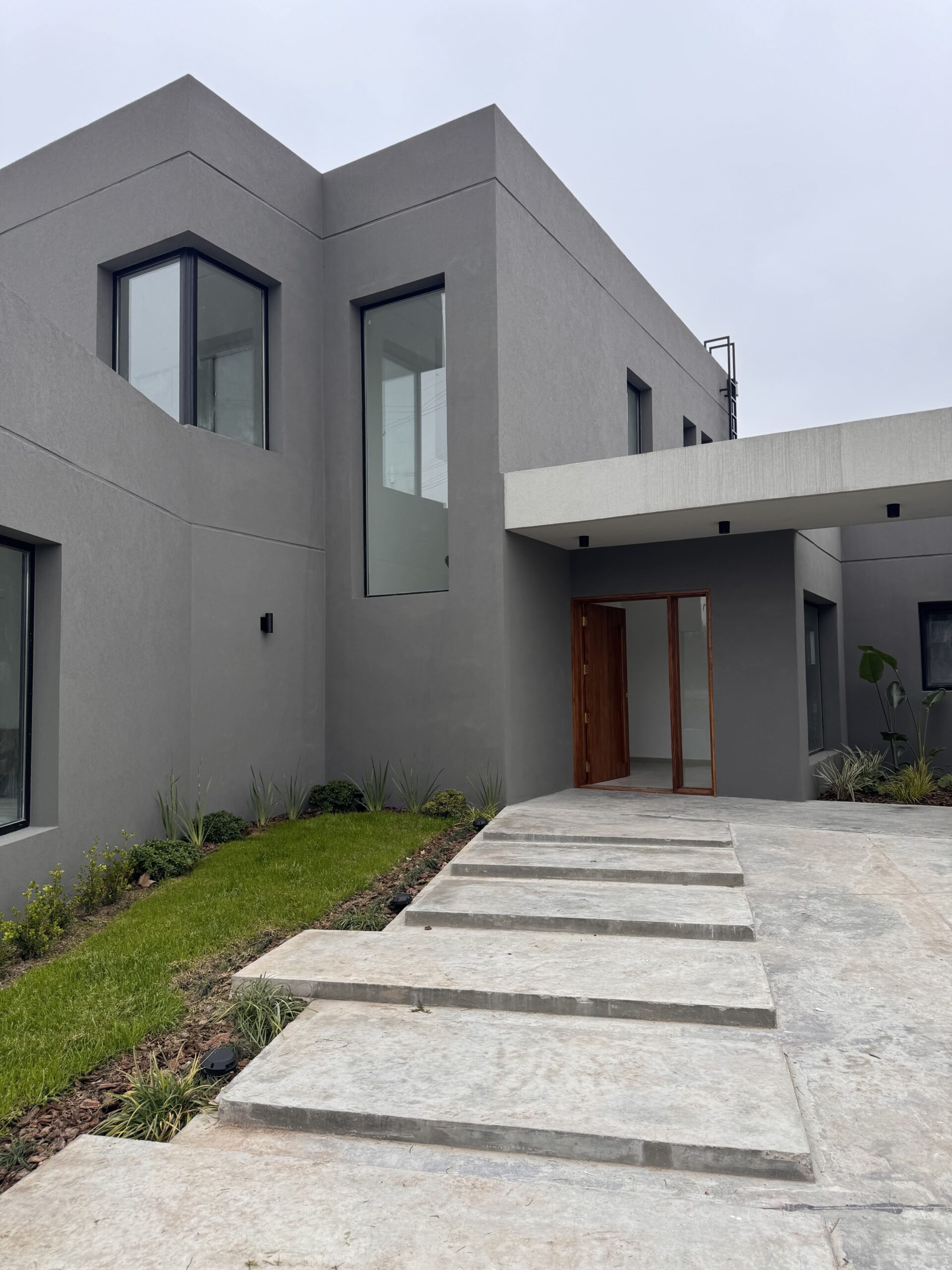 En términos de materiales y acabados, optamos por un revoque texturado que juega con dos tonos distintos, realzando el juego de volúmenes y añadiendo un toque visualmente interesante.