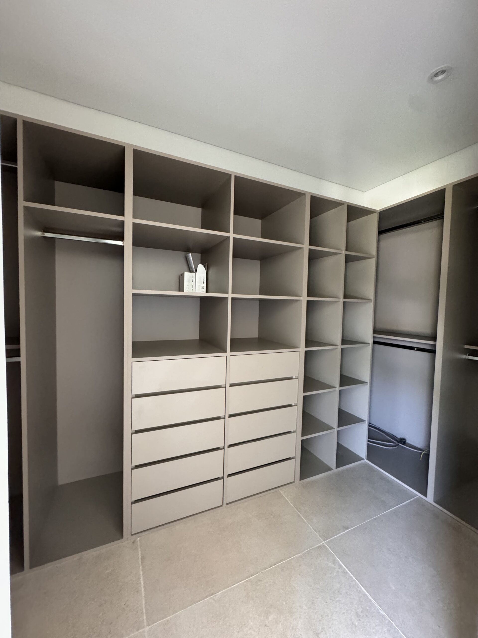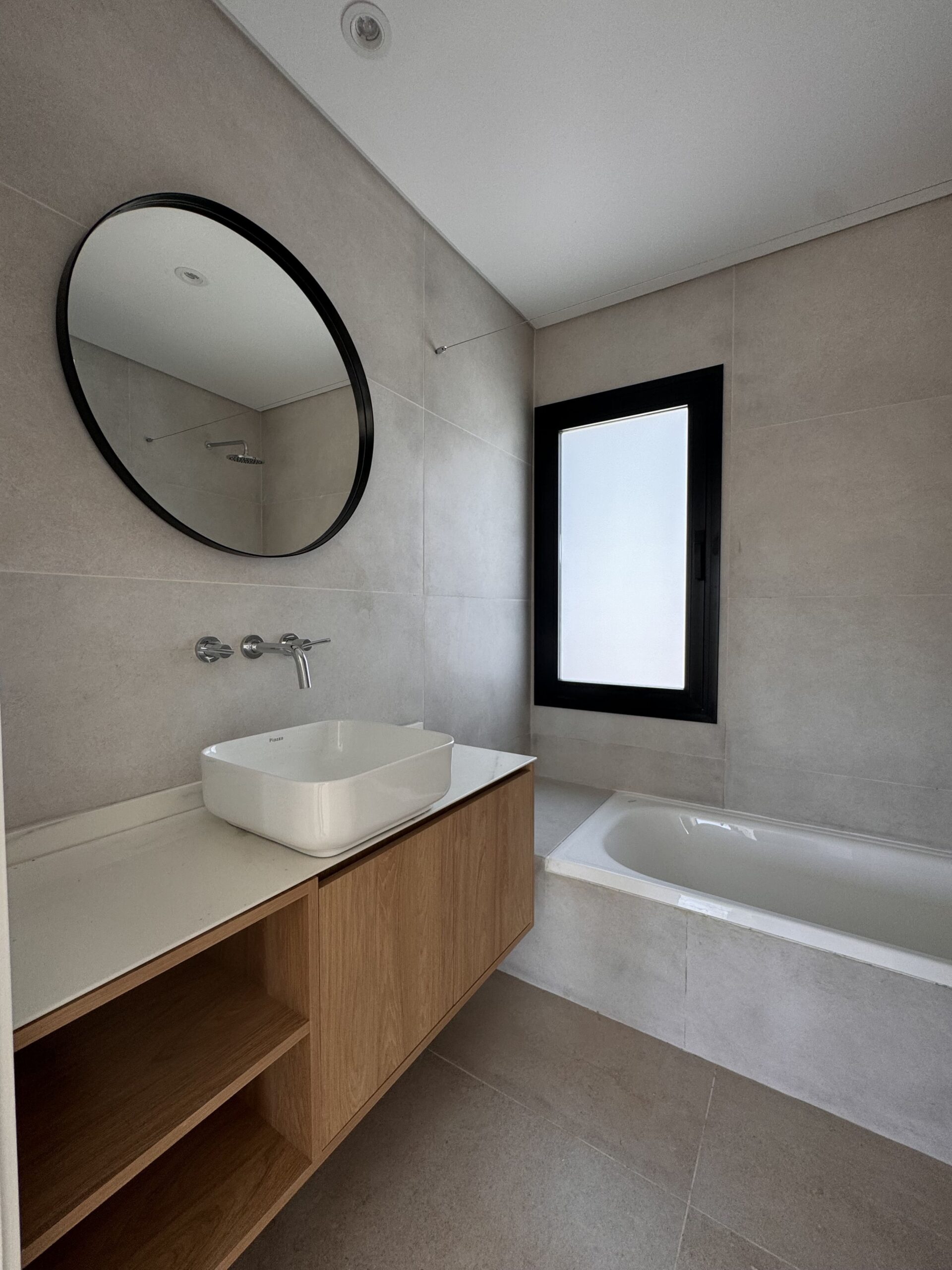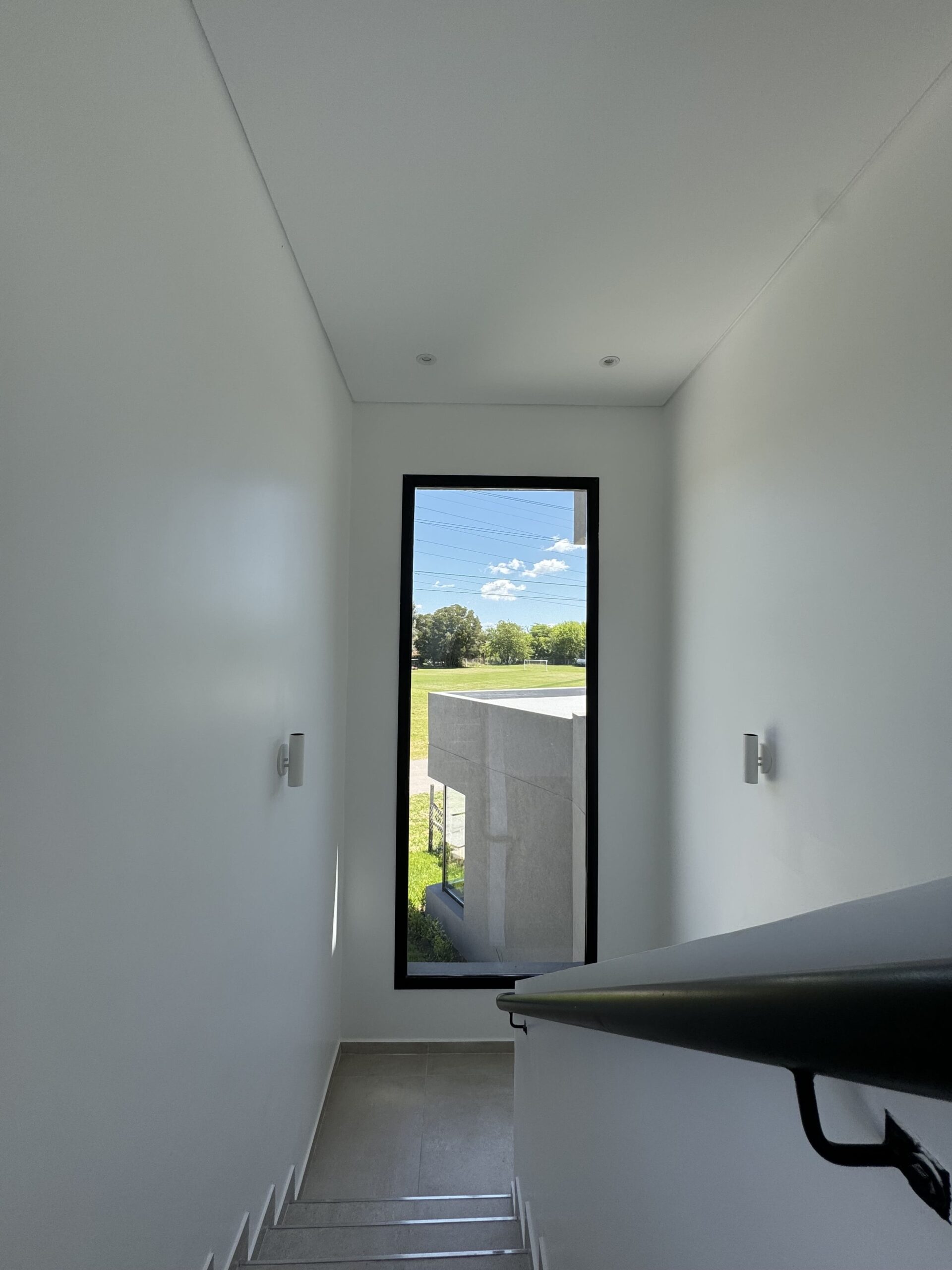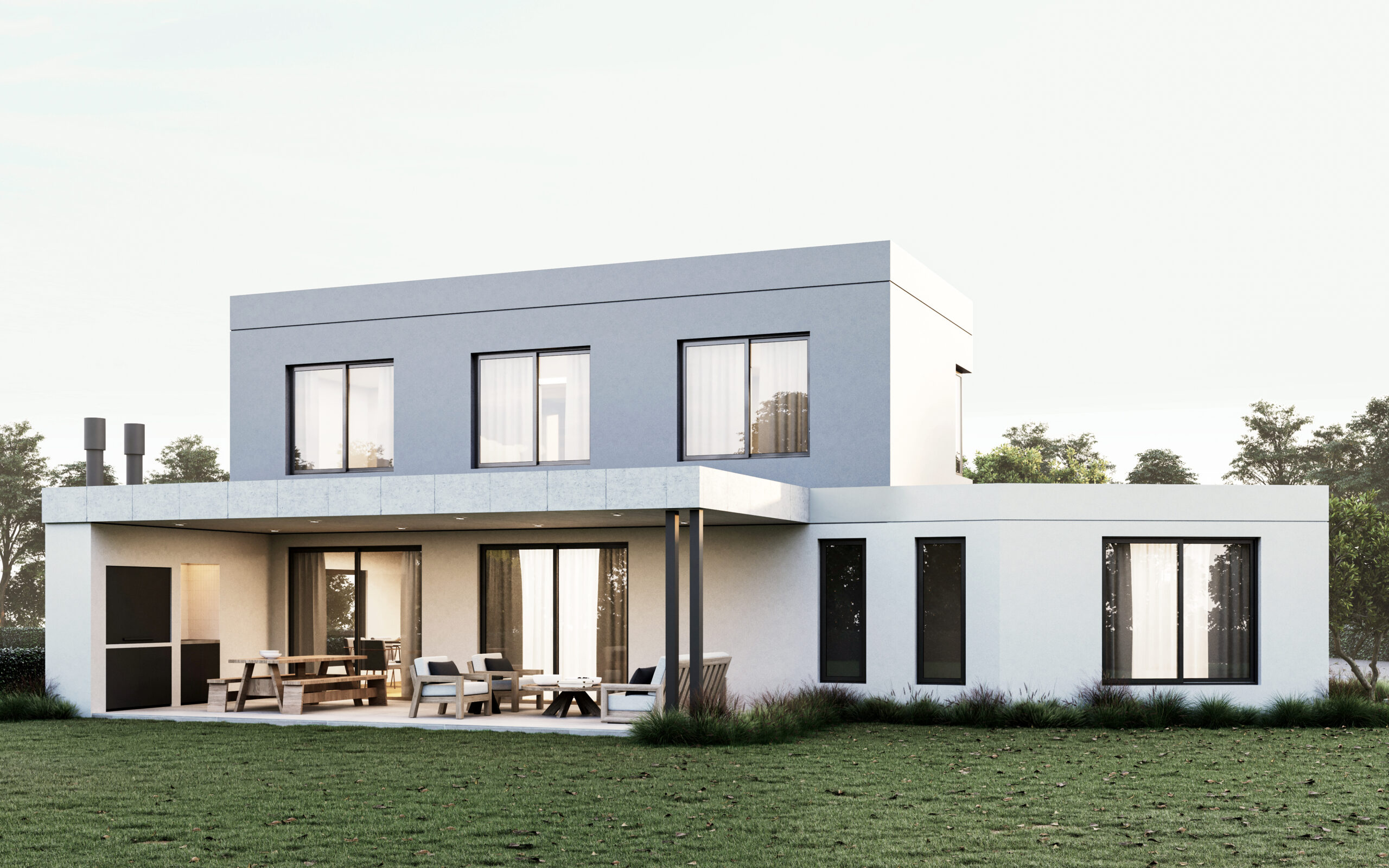 En términos de materiales y acabados, optamos por un revoque texturado que juega con dos tonos distintos, realzando el juego de volúmenes y añadiendo un toque visualmente interesante.