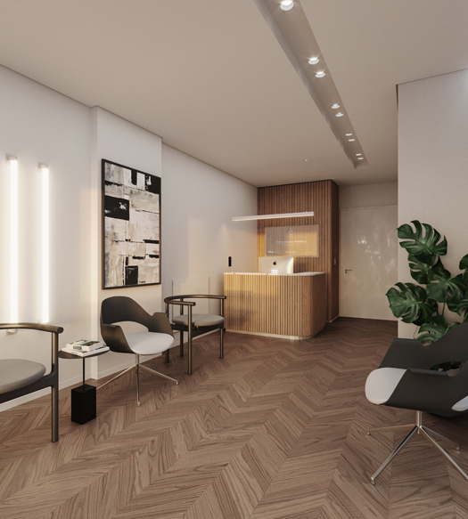 En la entrada, generamos un espacio de recepción con una sala de espera amplia y cómoda. Utilizamos materiales y colores que generan un ambiente relajante y agradable para los pacientes. Además, incorporamos una iluminación cálida y adecuada para este tipo de espacio.