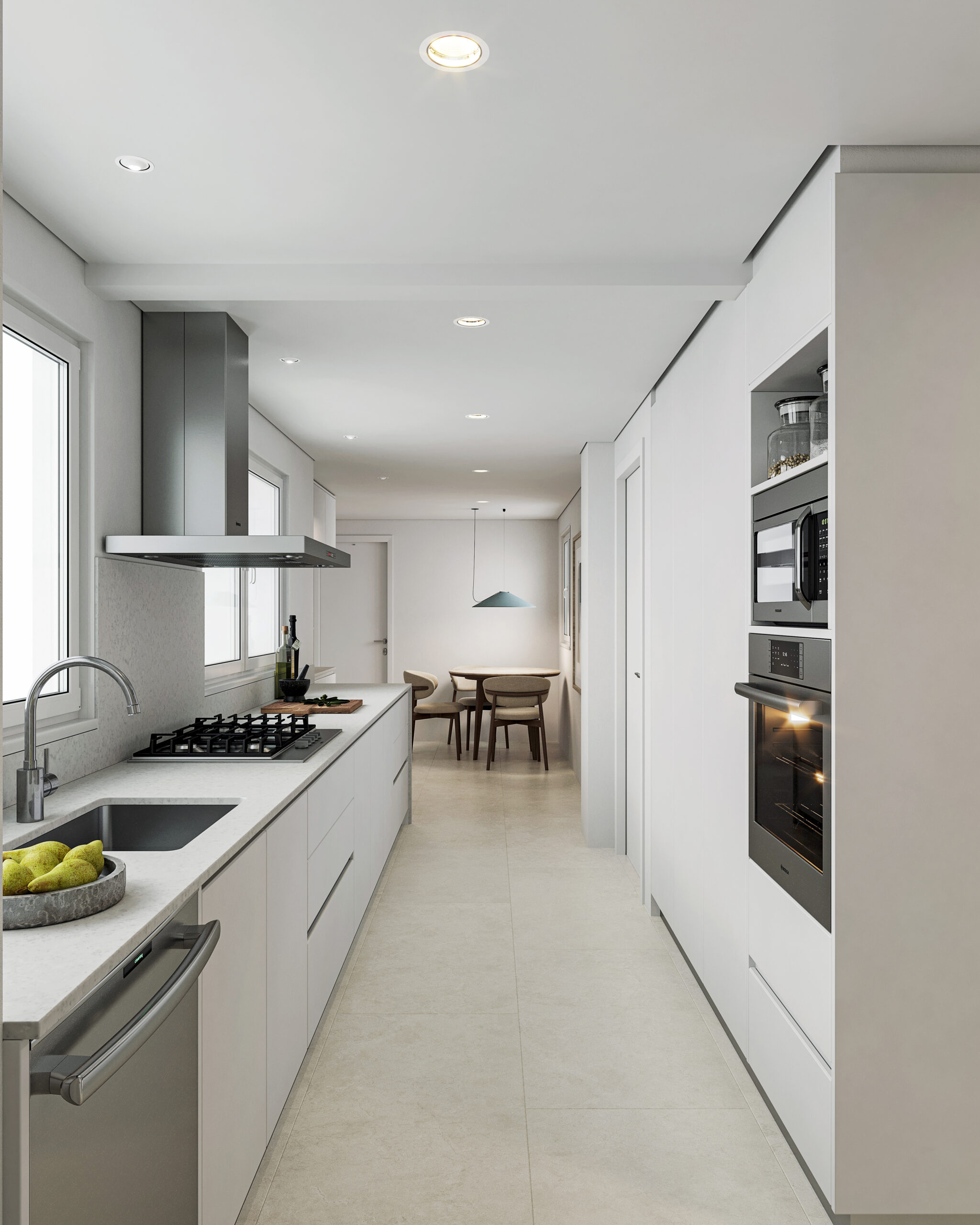 Los colores claros predominan en todos los ambientes, infundiendo paz y amplitud. Detalles en textura similar a la madera añaden calidez y carácter.