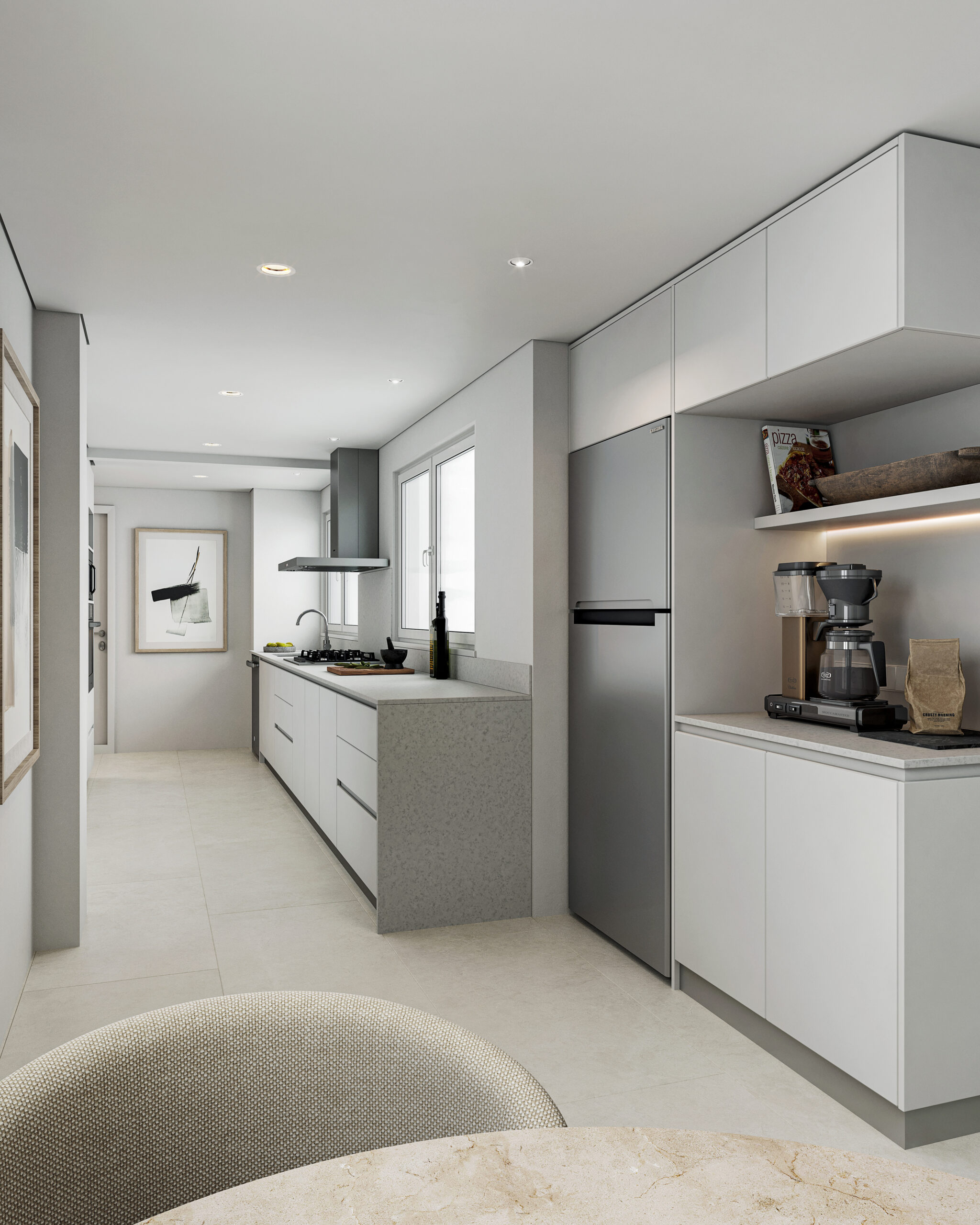 El protagonismo es indiscutible: la cocina. Creamos un frente continuo que fusiona almacenamiento y estilo, mientras que los electrodomésticos quedan estratégicamente ubicados para liberar espacio en la mesa de trabajo. ¡Y no podemos olvidar la estación desayunadora en el comedor diario, que brinda independencia y calidez!