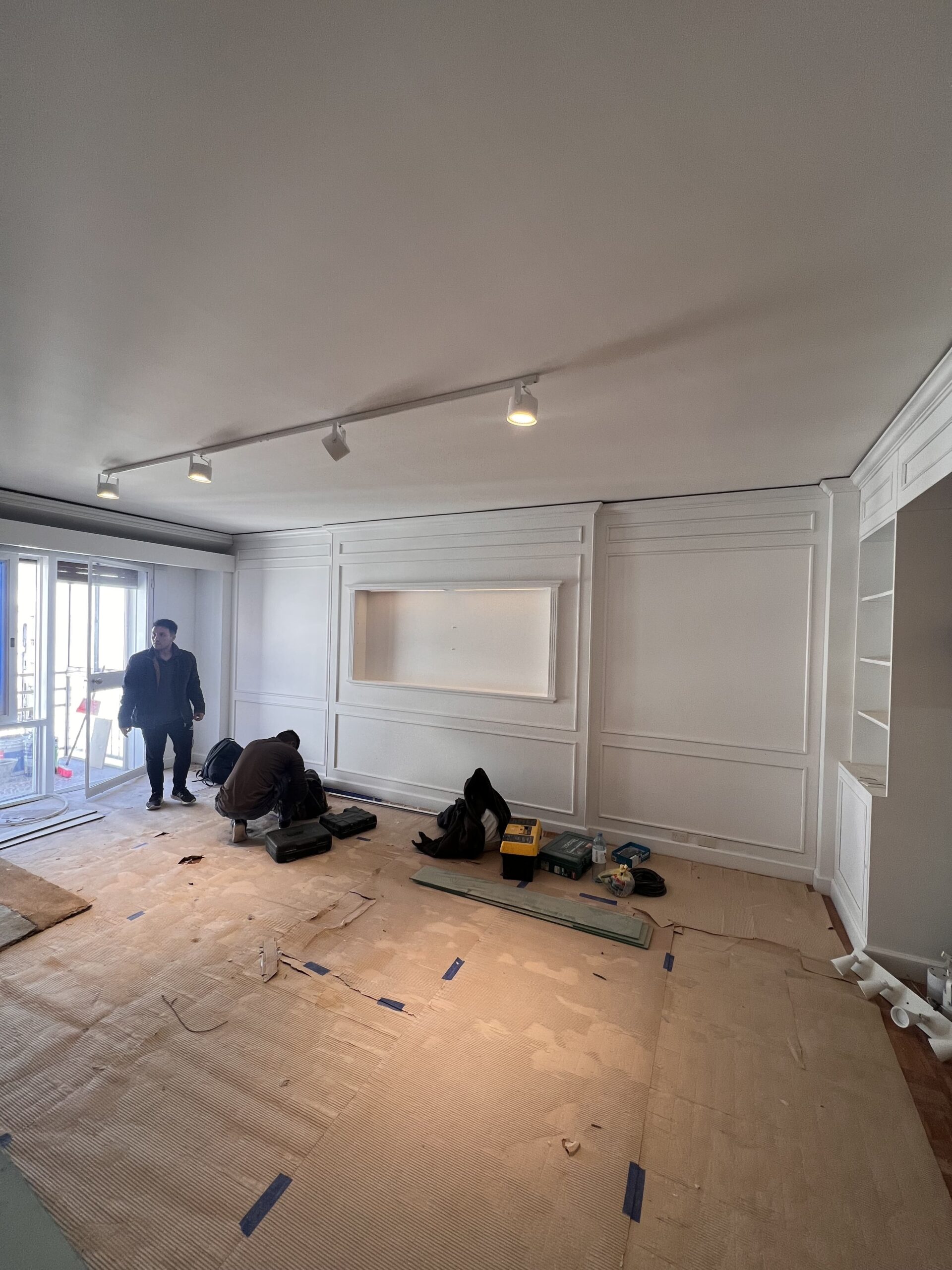 Las alfombras se despidieron para revelar un tesoro oculto: un hermoso parquet que se encontraba debajo. Lo pulimos e hidrolaqueamos para crear un suelo que transmite elegancia en cada paso.