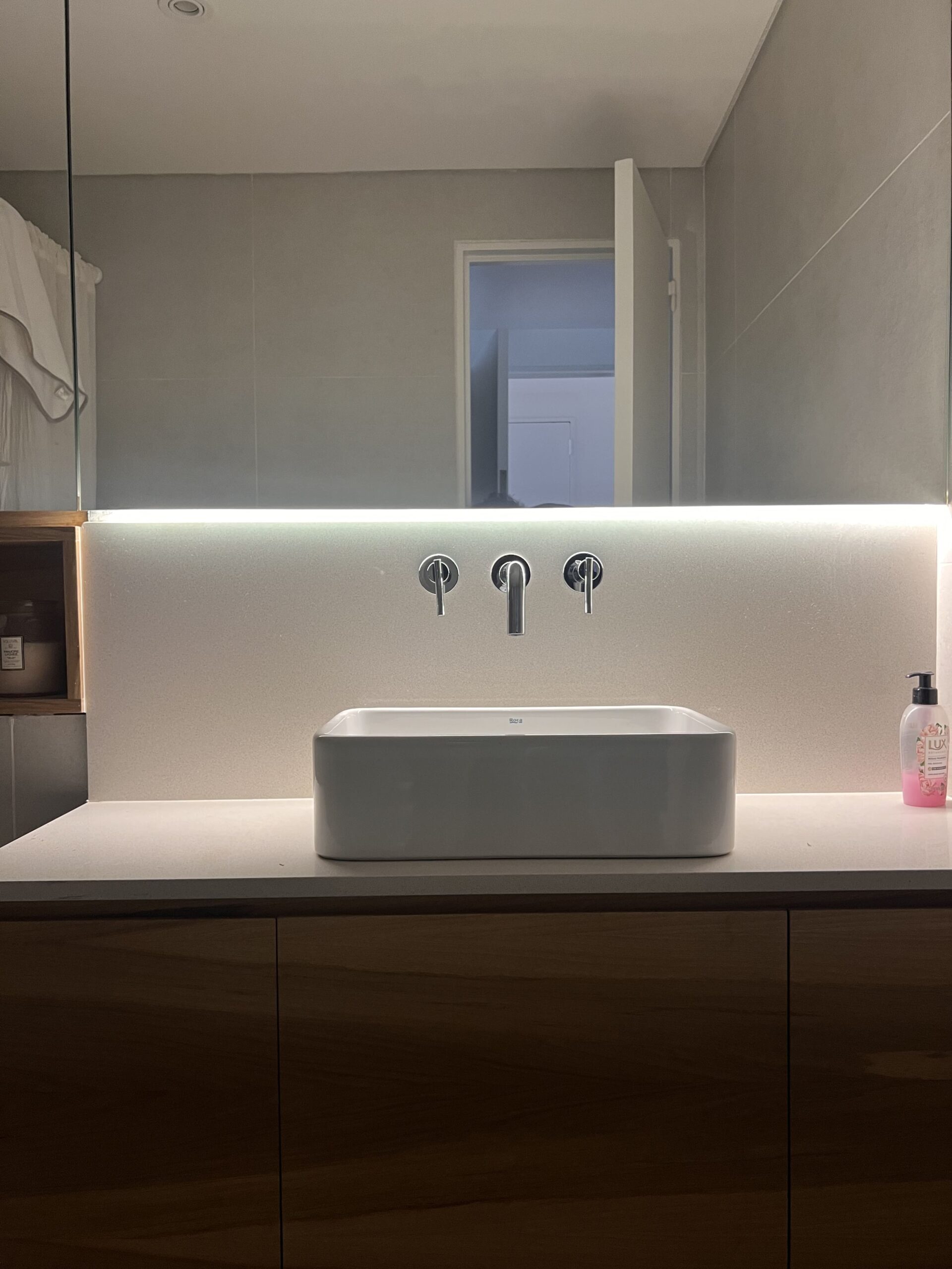La transformación también alcanzó los baños. Tres espacios, un objetivo: minimalismo y modernidad. Cada baño se reinventó con un diseño elegante y funcional, ajustándose a las necesidades actuales.
