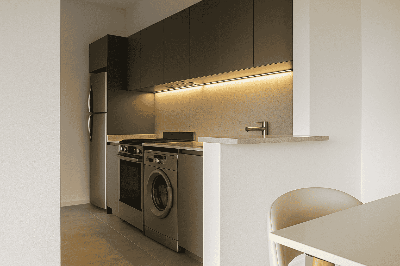 El foco principal del proyecto estuvo en la cocina. Originalmente subdividida mediante una arcada que limitaba su presencia dentro del conjunto, se decidió eliminar ese elemento para ampliar el espacio y darle mayor protagonismo dentro de la vivienda. A partir de esta operación se incorporó un nuevo esquema de guardado en altura, aprovechando la totalidad del plano vertical disponible, en respuesta directa al interés de los clientes por cocinar y optimizar la capacidad de almacenamiento. La eliminación de la puerta existente permitió además sumar un desayunador que refuerza la integración con el estar y mejora las visuales entre ambos ambientes.