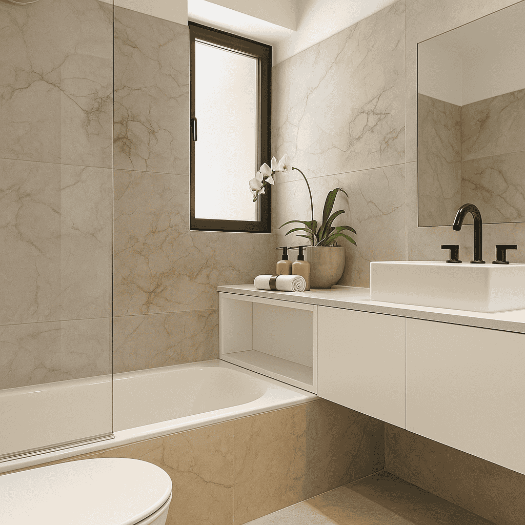 En el baño, la estrategia partió de conservar la bañera existente como condición del proyecto. A partir de esa premisa se diseñó un nuevo vanitory que acompaña su geometría y permite ampliar la superficie de apoyo, mejorando la funcionalidad sin modificar la estructura original del espacio.