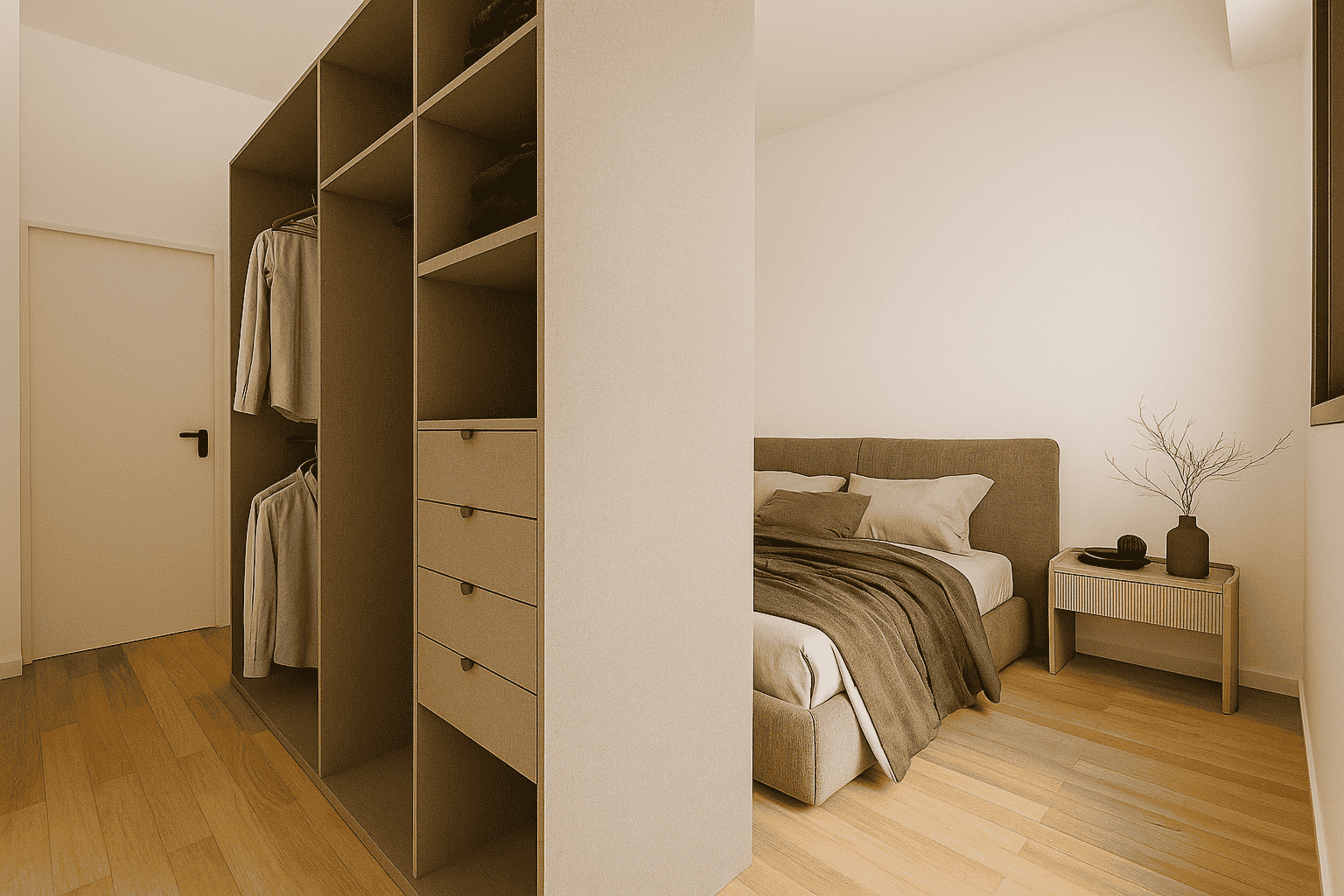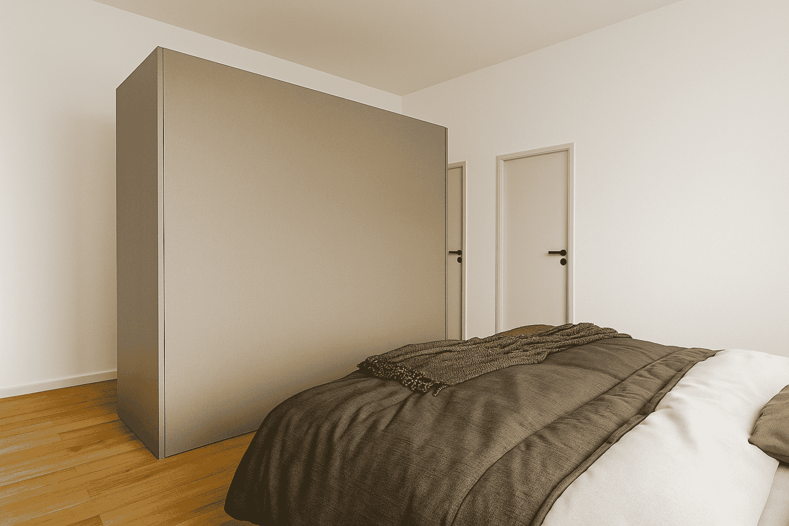 En el dormitorio, la intervención fue más puntual. Se incorporó un placard de gran capacidad que resuelve la ausencia de vestidor y reorganiza el guardado general del ambiente, integrando también el soporte para TV dentro del mismo sistema.